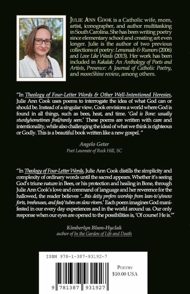 "In Theology of Four-Letter Words & Other Well-Intentioned Heresies, Julie Ann Cook uses poems to interrogate the idea of what God can or should be. Instead of a singular view, Cook envisions a world where God is found in all things such as bees, heat and time. "God is Bone: usually sturdy/sometimes frail/rarely seen". These poems are written with care and intentionality, while also challenging the ideal of what we think is righteous or Godly. This is a beautiful book written like a new gospel. " - Angelo Geter, Poet Laureate of Rock Hill, SC