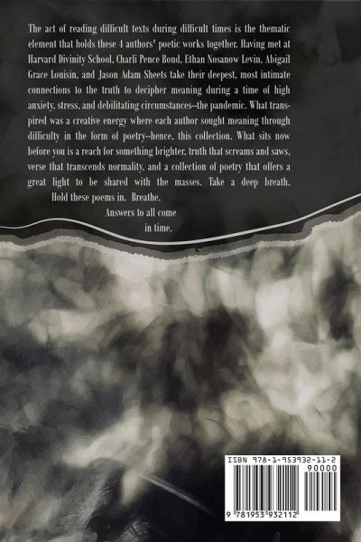 The act of reading difficult texts during difficult times is the thematic element that holds these 4 authors' poetic works together. Having met at Harvard Divinity School, Charli Pence Bond, Ethan Nosanow Levin, Abigail Grace Louisin, and Jason Adam Sheets take their deepest, most intimate connections to the truth to decipher meaning during a time of high anxiety, stress, and debilitating circumstances--the pandemic. What transpired was a creative energy where each author sought meaning through difficulty in the form of poetry--hence, this collection. What sits now before you is a reach for something brighter, truth that screams and saws, verse that transcends normality, and a collection of poetry that offers a great light to be shared with the masses. Take a deep breath. Hold these poems in. Breathe. Answers to all come in time.