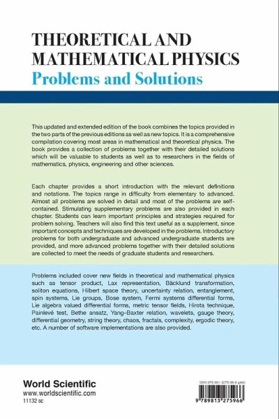 This updated and extended edition of the book combines the topics provided in the two parts of the previous editions as well as new topics. It is a comprehensive compilation covering most areas in mathematical and theoretical physics. The book provides a collection of problems together with their detailed solutions which will prove to be valuable to students as well as to researchers in the fields of mathematics, physics, engineering and other sciences. Each chapter provides a short introduction with the relevant definitions and notations. All relevant definitions are given. The topics range in difficulty from elementary to advanced. Almost all problems are solved in detail and most of the problems are self-contained. Stimulating supplementary problems are also provided in each chapter. Students can learn important principles and strategies required for problem solving. Teachers will also find this text useful as a supplement, since important concepts and techniques are developed in the problems. Introductory problems for both undergraduate and advanced undergraduate students are provided. More advanced problems together with their detailed solutions are collected, to meet the needs of graduate students and researchers. Problems included cover new fields in theoretical and mathematical physics such as tensor product, Lax representation, Bäcklund transformation, soliton equations, Hilbert space theory, uncertainty relation, entanglement, spin systems, Lie groups, Bose system, Fermi systems differential forms, Lie algebra valued differential forms, metric tensor fields, Hirota technique, Painlevé test, Bethe ansatz, Yang–Baxter relation, wavelets, gauge theory, differential geometry, string theory, chaos, fractals, complexity, ergodic theory, etc. A number of software implementations are also provided.