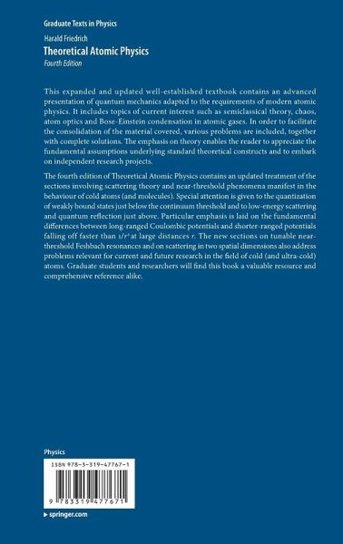 The fourth edition of Theoretical Atomic Physics contains anupdated treatment of the sections involving scattering theory and near-thresholdphenomena manifest in the behaviour of cold atoms (and molecules). Special attentionis given to the quantization of weakly bound states just below the continuum thresholdand to low-energy scattering and quantum reflection just above. Particular emphasisis laid on the fundamental differences between long-ranged Coulombic potentialsand shorter-ranged potentials falling off faster than 1/r2 at large distances r. The newsections on tunable near-threshold Feshbach resonances and on scattering in two spatialdimensions also address problems relevant for current and future research in the fieldof cold (and ultra-cold) atoms. Graduate students and researchers will find this book avaluable resource and comprehensive reference alike.