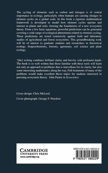 The cycling of elements such as carbon and nitrogen is of central importance in ecology, particularly when humans are causing changes to element cycles on a global scale. In this 1996 book a rigorous mathematical framework is developed to model how element cycles operate and interact in plants and soils, forming the foundations of a new ecosystem theory. From a few basic equations, powerful predictions can be generated covering a wide range of ecological phenomena related to element cycling. These predictions are tested extensively against field and laboratory studies of agricultural and forest ecosystems. This work will be of interest to graduate students and researchers in theoretical ecology, soil science, forestry and biogeochemistry.