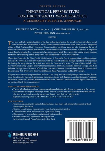 1. An overview of and rationale for a generalist-eclectic approach to direct social work practice 2. The problem-solving model framework: A framework for integrating the science and art of practice 3. Critical ecological systems theory 4. Individual and family development theory 5. Couples theory and intervention 6. Strengths-based social work: A social work metatheory to guide the profession 7. The Psychodynamic Approach 8. CBT theory and treatment 9. The crisis intervention model 10. Dialectical Behavior Therapy for the treatment of Borderline Personality Disorder 11. Trauma informed practice 12. Client centered theory 13. Emotion focused theory 14. Motivational interviewing 15. Feminist theory 16. Empowerment theory 17. Anti-oppressive theory 18. Narrative approaches 19. Collaborative- Dialogic therapy 20. Solution focused therapy 21. Mindfulness based approaches 22. Eye Movement Desensitization and Reprocessing