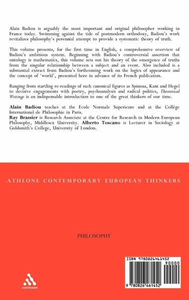 Alain Badiou is arguably the most important and original philosopher working in France today. Swimming against the tide of postmodern orthodoxy, Badiou's work revitalizes philosophy's perennial attempt to provide a systematic theory of truth. This volume presents for the first time in English a comprehensive overview of Badiou's ambitious system. Beginning with Badiou's controversial assertion that ontology is mathematics, this volume sets out his theory of the emergence of truths from the singular relationship between a subject and an event. Also included is a substantial extract from Badiou's forthcoming work on the logics of appearance and the concept of world, presented here in advance of its French publication. Ranging from startling re-readings of canonical figures (Spinoza, Kant and Hegel) to decisive engagements with poetry, psychoanalysis and radical politics, Theoretical Writings is an indispensable introduction to one of the great thinkers of our time. The volume also features a preface written by the author especially for this collection.