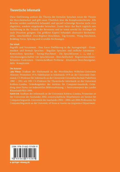 Das Buch basiert auf Vorlesungen, die die Autoren für Studierende der Informatik im Grundstudium an den Universitäten Paderborn und Koblenz gehalten haben. Sämtliche Beweise werden in dem Buch detailliert ausgeführt. Und gerade die besonders schwierigen werden nicht abgekürzt, sondern umso eingehender betrachtet. Damit bietet dieses Buch zugleich eine Einführung in die Technik des Beweisens. Mit der ausführlichen Behandlung aller Beweise eignet sich das Lehrbuch besonders für Einsteiger indas Gebiet der Theoretischen Informatik. Aber auch Dozenten profitieren insbesondere von der Vorstellung alternativer Berechnungsmodelle.