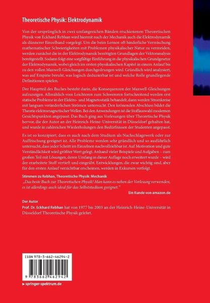 Dieses bekannte Lehrbuch stellt zunächst die für die Elektrodynamik benötigten mathematischen Grundlagen bereit, um die Vermischung mathematischer Schwierigkeiten mit Problemen physikalischer Natur zu vermeiden. Es folgt eine sorgfältige Einführung in die physikalischen Grundgesetze der Elektrodynamik bis hin zu den vollen Maxwell-Gleichungen. In den weiteren Kapiteln werden, allmählich vom Leichteren zum Schwereren fortschreitend, unter anderem die Konsequenzen der Maxwell-Gleichungen aufgezeigt und die Theorie elektromagnetischer Wellen behandelt. Das Buch ist auf die Bedürfnisse von Studierenden angepasst aber auch darüber hinaus als Nachschlagewerk geeignet. In dieser Auflage wurde die Anzahl der Aufgaben mit Lösungen erhöht.