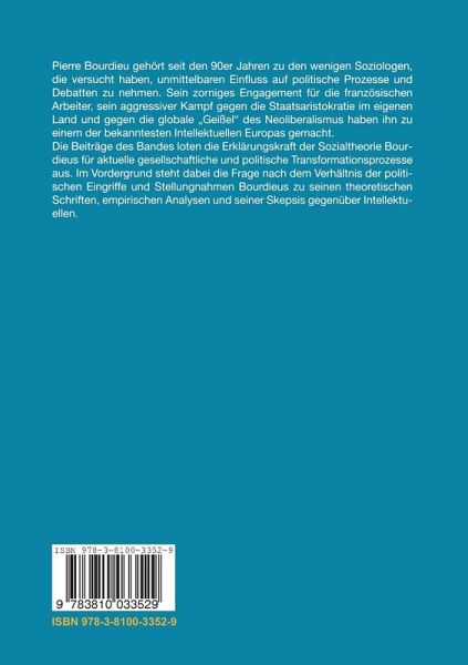 Der Band beleuchtet das Verhältnis zwischen Bourdieus Sozialtheorie und politischem Kampf. Das Buch lotet die Reichweite und Erklärungskraft der Sozialtheorie Pierre Bourdieus für gesellschaftliche Transformationsprozesse im Kontext des neoliberalen Diskurses aus. Bourdieu gehört seit den 90erJahren zu den wenigen Soziologen, die versucht haben, unmittelbaren Einfluss auf politische Prozesse und Debatten zu nehmen. Im Buch wird die Reichweite der politischen Soziologie Bourdieus diskutiert. In welchem Verhältnis steht das politische Engagement Bourdieus zu seinen theoretischen Schriften, empirischen Analysen und seiner Skepsis gegenüber Intellektuellen.