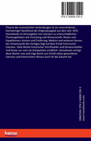 Theorie der aromatischen Verbindungen ist ein unveränderter, hochwertiger Nachdruck der Originalausgabe aus dem Jahr 1876.Hansebooks ist Herausgeber von Literatur zu unterschiedlichen Themengebieten wie Forschung und Wissenschaft, Reisen und Expeditionen, Kochen und Ernährung, Medizin und weiteren Genres. Der Schwerpunkt des Verlages liegt auf dem Erhalt historischer Literatur. Viele Werke historischer Schriftsteller und Wissenschaftler sind heute nur noch als Antiquitäten erhältlich. Hansebooks verlegt diese Bücher neu und trägt damit zum Erhalt selten gewordener Literatur und historischem Wissen auch für die Zukunft bei.