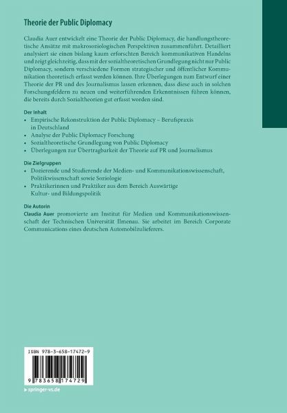 Claudia Auer entwickelt eine Theorie der Public Diplomacy, die handlungstheoretische Ansätze mit makrosoziologischen Perspektiven zusammenführt. Detailliert analysiert sie einen bislang kaum erforschten Bereich kommunikativen Handelns und zeigt gleichzeitig, dass mit der sozialtheoretischen Grundlegung nicht nur Public Diplomacy, sondern verschiedene Formen strategischer und öffentlicher Kommunikation theoretisch erfasst werden können. Ihre Überlegungen zum Entwurf einer Theorie der PR und des Journalismus lassen erkennen, dass diese auch in solchen Forschungsfeldern zu neuen und weiterführenden Erkenntnissen führen können, die bereits durch Sozialtheorien gut erfasst worden sind.