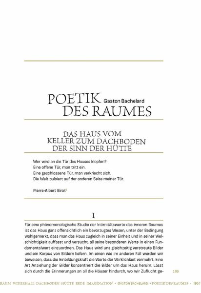 Mit Beiträgen von Gaston Bachelard, Ernst Bloch, Pierre Bourdieu, Michel de Certeau, Paul-Henry Chombart de Lauwe, Luce Giard, Martin Heidegger, Henri Lefebvre, Georges- Hubert de Radkowski, Amos Rapoport und Hermann Schmitz