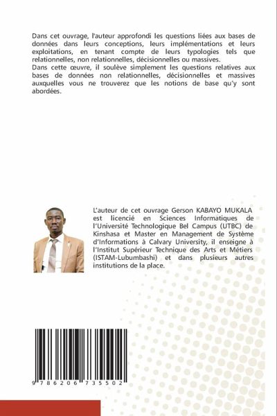Dans cet ouvrage, l'auteur approfondi les questions liées aux bases de données dans leurs conceptions, leurs implémentations et leurs exploitations, en tenant compte de leurs typologies tels que relationnelles, non relationnelles, décisionnelles ou massives.Dans cette oeuvre, il soulève simplement les questions relatives aux bases de données non relationnelles, décisionnelles et massives auxquelles vous ne trouverez que les notions de base qu'y sont abordées.