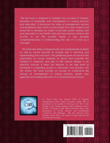 This text book is designed to highlight the concepts of theories, principles of leadership and management in nursing practice and education. It introduces the steps of management process and leadership styles which would enable the nurse students and personnel to develop an insight to provide quality nursing care and education in any health care and educational center in the country to suit the societal needs. It also provides comprehensiveness in understanding the role of a nurse as a manager.This book also helps undergraduate and postgraduate students as well as novice teacher to acquire skills in planning and implementing the curriculum.