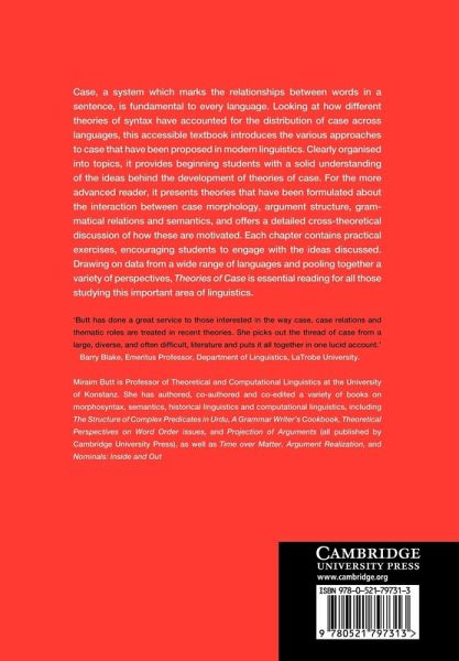 Case, a system which marks the relationships between words in a sentence, is fundamental to every language. Looking at how different theories of syntax have accounted for the distribution of case across languages, this accessible 2006 textbook introduces the various approaches to case that have been proposed in modern linguistics. Clearly organised into topics, it provides beginning students with a solid understanding of the ideas behind the development of theories of case. For the more advanced reader, it presents theories that have been formulated about the interaction between case morphology, argument structure, grammatical relations and semantics, and offers a detailed cross-theoretical discussion of how these are motivated. Each chapter contains practical exercises, encouraging students to engage with the ideas discussed. Drawing on data from a wide range of languages and pooling together a variety of perspectives, Theories of Case is essential reading for all those studyingthis important area of linguistics.