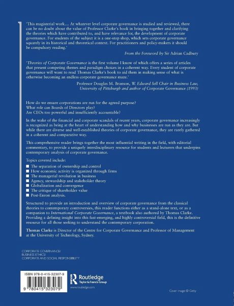 '[A] magisterial work. At whatever level corporate governance is being studied and reviewed, there can be no doubt about the value of Professor Clarke's book in bringing together and clarifying the theories which have contributed to, and have relevance for, the development of corporate governance.' - Sir Adrian Cadbury