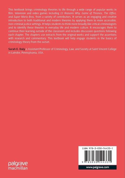 This textbook brings criminology theories to life through a wide range of popular works in film, television and video games including 13 Reasons Why, Game of Thrones, The Office, and Super Mario Bros, from a variety of contributors. It serves as an engaging and creative introduction to both traditional and modern theories by applying them to more accessible, non-criminal justice settings. It helps students to think more broadly like critical criminologists and to identify these theories in everyday life and modern culture. It encourages them to continue their learning outside of the classroom and includes discussion questions following each chapter. The chapters use extracts from the original works and support the assertions with research and commentary. This textbook will help engage students in the basics of criminology theory from the outset.