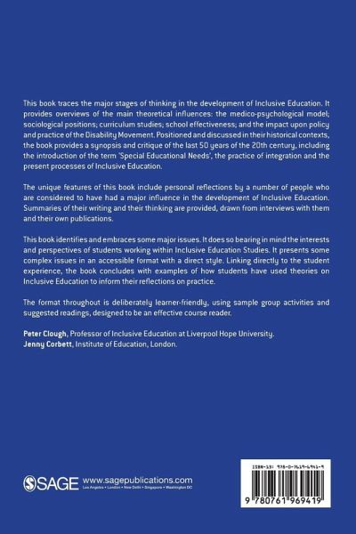 This book traces the major stages of thinking in the development of inclusive education. It provides overviews of the main theoretical influences: the medico-psychological model; sociological positions; curriculum studies; school effectiveness and the impact upon policy and practice of the Disability Movement. Positioned and discussed in their historical contexts the book provides a synopsis and critique of the last 50 years of the 20th century, including the introduction of the term 'special educational needs', the practice of integration and the present processes of inclusive education.