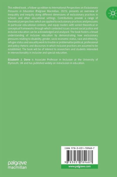 Chapter 1: Introduction.- Part 1: Exclusion: (Re)visiting Theory.- Chapter 2: Defectology as a Theory of Inclusion.- Chapter 3: Still Resisting After All These Years: Traditional Special Education Leadership's Fears of Inclusive Education in the USA.- Chapter 4: 'Belonging' and Inclusive Refugee Education.- Chapter 5: 'In This Sense, We Use the Term Integration and Thus Implement the UNCRPD': Theorising Exclusionary Pressures in Switzerla.- Chapter 6: Neoliberalisation and Logics of Practice in Alternative Provision.- Part II: Theorising In/Exclusionary Practices.- Chapter 7: Assigned Territories: On the Nexus of Diagnosing and Distancing in Inclusive Schools Through Goffman's Lens.- Chapter 8: This Is What We Should (Not) Be Doing.- Chapter 9: Twice Exceptional Students in the Inclusive Education of the UK.- Chapter 10: Lost in Translation: When Differentiated Instruction Takes an Exclusionary Turn.- Chapter 11: 'I Can't Hear It'. Exploring In/Exclusionary Age-Appropriate Research with Young Children.- Chapter 12: The Digital Divide as an Exclusionary Pressure in Education.- Part III: Theorising Prejudicial Logics.- Chapter 13: 'I Was Low-Key Disruptive, But Teachers Always Saw Me as Trouble'. Addressing Discipline Disparities of Black Girls in English Secondary Schools.- Chapter 14: Transforming Punitive Relations for Education Justice.- Chapter 15: Double Discrimination: A Feminist Poststructuralist Intersecting of Gender and Intellectual Disability in Education and Society.- Chapter 16: Exclusionary Practices in the Academic Journeys of Culturally Diverse Students in Southern Chile.- Chapter 17: First-In-Family Students in Australian Higher Education: Investigating Socioeconomic Status as an Exclusionary Pressure.- Chapter 18: Child as Accepted 'Excluded Other' in South African Schooling.