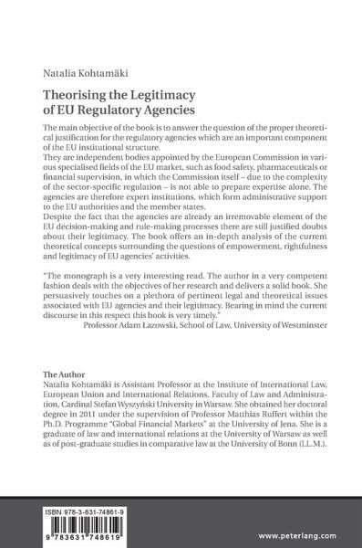 They are independent bodies appointed by the European Commission in various specialised fields of the EU market, such as food safety, pharmaceuticals or financial supervision, in which the Commission itself - due to the complexity of the sector-specific regulation - is not able to prepare expertise alone. The agencies are therefore expert institutions, which form administrative support to the EU authorities and the member states. Despite the fact that the agencies are already an irremovable element of the EU decision-making and rulemaking processes there are still justified doubts about their legitimacy. The book offers an in-depth analysis of the current theoretical concepts surrounding the questions of empowerment, rightfulness and legitimacy of EU agencies' activities.