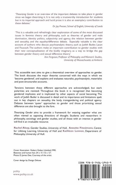 This accessible text aims to give a theoretical overview of approaches to gender. The book discusses the major theories concerned with the ways in which we 'become engendered', and explains and evaluates naturalist, psychoanalytic, materialist and post-structuralist accounts. Tensions between these different approaches are acknowledged , but stark polarities are resisted. Throughout the book it is recognized that becoming gendered implicates and is implicated by other aspects of social becoming. The work of Judith Butler is discussed in detail and its importance and limitations spelt out in key chapters on sexuality, the body, transgendering and political agency. Debates between 'queer' approaches to gender and those prioritizing sexual difference are also brought to the fore. Theorizing Gender aims to provide a framework for weaving together what are often viewed as opposing directions of thought. Students and researchers in sociology, philosophy and gender studies, and all those with an interest in gender will find it an invaluable resource.