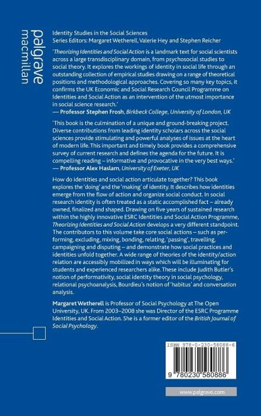 'Theorizing Identities and Social Action is a landmark text for social scientists across a large transdisciplinary domain, from psychosocial studies to social theory. It explores the workings of identity in social life through an outstanding collection of empirical studies drawing on a range of theoretical positions and methodological approaches. Covering so many key topics, it confirms the UK Economic and Social Research Council Programme on Identities and Social Action as an intervention of the utmost importance in social science research.' - Professor Stephen Frosh, Birkbeck College, University of London, UK
