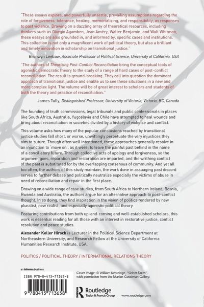 The founding of truth commissions, legal tribunals, and public confessionals in places like South Africa, Australia, Yugoslavia, and Chile have attempted to heal wounds and bring about reconciliation in societies divided by a history of violence and conflict. This volume asks how many of the popular conclusions reached by transitional justice studies fall short, or worse, unwittingly perpetuate the very injustices they aim to suture. Though often well intentioned, these approaches generally resolve in an injunction to "move on," as it were; to leave the painful past behind in the name of a conciliatory future. Through collective acts of apology and forgiveness, so the argument goes, reparation and restoration are imparted, and the writhing conflict of the past is substituted for by the overlapping consensus of community. And yet all too often, the authors of this study maintain, the work done in assuaging past discord serves to further debase and politically neutralize especially the victims of abuse in need of reconciliation and repair in the first place. Drawing on a wide range of case studies, from South Africa to Northern Ireland, Bosnia, Rwanda and Australia, the authors argue for an alternative approach to post-conflict thought. In so doing, they find inspiration in the vision of politics rendered by new pluralist, new realist, and especially agonistic political theory. Featuring contributions from both up and coming and well-established scholars this work is essential reading for all those with an interest in restorative justice, conflict resolution and peace studies.