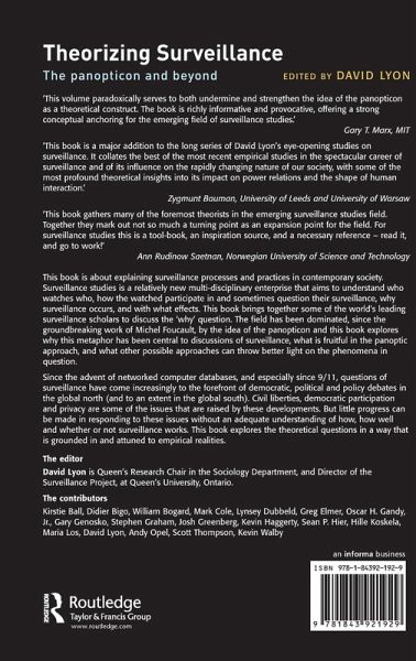 This book is about explaining surveillance processes and practises in contemporary society. Surveillance studies is a relatively new multi-disciplinary enterprise the aims to understand who watches who, how the watched participate in and sometimes question their surveillance, why surveillance occurs, and with what effects. This book brings together some of the world's leading surveillance scholars to discuss the 'why' question. The field has been dominated since the groundbreaking work of Michel Foucault, by the idea of panopticon and this book explores why this metaphor has been central in discussions of surveillance, what is fruitful in the panooptic approach and what are the possible approaches can throw better light on the phenomena in question. Since the advent of networked computer databases and especially since 9/11 questions of surveillance have come increasingly to the forefront of democratic political and policy debates in the global north and to an extent in the global South). Civil liberties democratic participation and privacy are some of the issues that are raised by these developments. But little progress can be made in responding to these issues without an adequate understanding of how, how well and whether or not surveillance works. This book explores the theoretical questions in a way that is grounded in and attuned to empirical realities.