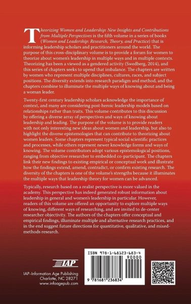 A volume in Women and Leadership: Research, Theory, and Practice Theorizing Women and Leadership: New Insights and Contributions from Multiple Perspectives is the fifth volume in the Women and Leadership: Research, Theory, and Practice series. This cross¿disciplinary series, from the International Leadership Association, enhances leadership knowledge and improves leadership development of women around the world. The purpose of this volume is to provide a forum for women to theorize about women's leadership in multiple ways and in multiple contexts. Theorizing has been a viewed as a gendered activity (Swedberg, 2014), and this series of chapters seeks to upend that imbalance. The chapters are written by women who represent multiple disciplines, cultures, races, and subject positions. The diversity extends into research paradigm and method, and the chapters combine to illuminate the multiple ways of knowing about and being a woman leader. Twenty¿first century leadership scholars acknowledge the importance of context, and many are considering post¿heroic leadership models based on relationships rather than traits. This volume contributes to this discussion by offering a diverse array of perspectives and ways of knowing about leadership and leading. The purpose of the volume is to provide readers with not only interesting new ideas about women and leadership, but also to highlight the diverse epistemologies that can contribute to theorizing about women leaders. Some chapters represent typical social scientific practices and processes, while others represent newer knowledge forms and ways of knowing. The volume contributors adopt various epistemological positions, ranging from objective researcher to embedded cöparticipant. The chapters link their new findings to existing empirical or conceptual work and illustrate how the findings extend, amend, contradict, or confirm existing research. The diversity of the chapters is one of the volume's strengths because it illuminates the multiple ways that leadership theory for women can be advanced. Typically, research based on a realist perspective is more valued in the academy. This perspective has indeed generated robust information about leadership in general and women's leadership in particular. However, readers of this volume are offered an opportunity to explore multiple ways of knowing, different ways of researching, and are invited to de¿center researcher objectivity. The authors of the chapters offer conceptual and empirical findings, illuminate multiple and alternative research practices, and in the end suggest future directions for quantitative, qualitative, and mixed¿methods research.