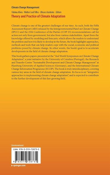 Climate change is one of the greatest challenges of our time. As such, both the Fifth Assessment Report (AR5) released by the Intergovernmental Panel on Climate Change (IPCC) and the 25th Conference of the Parties (COP 25) recommendations call for action not only from government, but also from various stakeholders. Apart from the knowledge offered by modeling and forecasts, which allows the readers to understand the problem and how it is likely to develop in the future, the book highlights approaches, methods and tools that can help readers cope with the social, economic and political problems posed by climate change. In other words, the book's goal is to accelerate developments in the field of climate change adaptation. This book gathers papers presented at the "2nd World Symposium on Climate Change Adaptation", a joint initiative by the University of Coimbra (Portugal), the Research and Transfer Centre "Sustainable Development and Climate Change Management"at Hamburg Universityof Applied Sciences (Germany), and the International Climate Change Information Programme (ICCIP). The book is truly interdisciplinary, covering various key areas in the field of climate change adaptation. Its focus is on "integrative approaches to implementing climate change adaptation", and is expected to contribute to the further development of this fast-growing field.