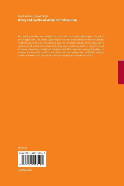 Basic terms and concepts.- The structure of the metal-solution interface.- Electrochemical thermodynamics and electrochemical kinetics.- Influence of diffusion on the rate of electrochemical process.- Nucleation.- Morphology of the growing metal surface.- Potential distribution in the volume of solution and current distribution on the electrode surface.- Current density distribution on rough surfaces.- Using of pulse and periodic currents in electrodeposition and in electrochemical experiments.- Electrodeposition of alloys.- Codeposition of impurities. Hydrogenation.- Technologies for deposition of several metals and alloys.- Structure of electrodeposited metals and alloys.- Physical properties of deposited macrolayers of metals and alloys. Control of quality and testing methods.- Conclusion
