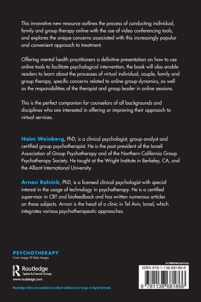 Haim Weinberg, PhD, is a clinical psychologist, group analyst and certified group psychotherapist. He is the past president of the Israeli Association of Group Psychotherapy and of the Northern California Group Psychotherapy Society. He taught at the Wright Institute in Berkeley, CA, and the Alliant International University. Arnon Rolnick, PhD, is a licensed clinical psychologist with special interest in the usage of technology in psychotherapy. He is a certified supervisor in CBT and biofeedback and has written numerous articles on these subjects. Arnon is the head of a clinic in Tel-Aviv, Israel, which integrates various psychotherapeutic approaches.