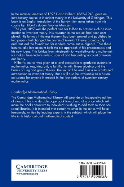 In the summer semester of 1897 David Hilbert (1862-1943) gave an introductory course in Invariant Theory at the University of Gottingen. This book is an English translation of the handwritten notes taken from this course by Hilbert's student Sophus Marxen. The year 1897 was the perfect time for Hilbert to present such an introduction to invariant theory. His research in the subject had been completed. His famous finiteness theorem had been proved and published in two papers that changed the course of invariant theory dramatically and that laid the foundation for modern commutative algebra. Thus these lectures take into account both the old approach of his predecessors and his new ideas. This bridge from nineteenth- to twentieth-century mathematics makes these lecture notes a special and fascinating account of invariant theory. Hilbert's course was given at a level accessible to graduate students in mathematics, requiring only a familiarity with linear algebra and the basics of ring and group theory. The text will be useful as a self-contained introduction to invariant theory. But it will also be invaluable as a historical source for anyone interested in the foundations of twentieth-century mathematics.