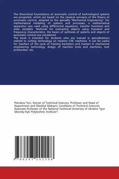 The theoretical foundations of automatic control of technological systems are presented, which are based on the classical concepts of the theory of automatic control, adapted to the specialty "Mechanical Engineering". For mathematical modeling of systems and processes, a mathematical apparatus was used using differential equations, transfer functions and state variables. Methods for evaluating objects using transient and frequency characteristics, the basics of synthesis of systems and objects of automatic control are considered.The book is intended for students who are trained in specializations related to cutting technology on modern CNC machines. It can be useful for teachers of the cycle of training bachelors and masters in mechanical engineering technology, design of machine tools and machines, tool production, etc.