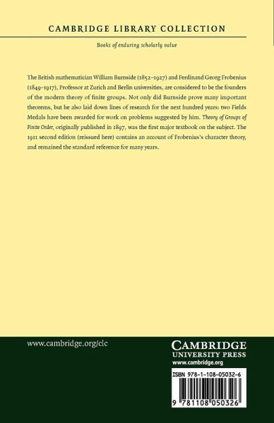 The British mathematician William Burnside (1852-1927) and Ferdinand Georg Frobenius (1849-1917), Professor at Zurich and Berlin universities, are considered to be the founders of the modern theory of finite groups. Not only did Burnside prove many important theorems, but he also laid down lines of research for the next hundred years: two Fields Medals have been awarded for work on problems suggested by him. The Theory of Groups of Finite Order, originally published in 1897, was the first major textbook on the subject. The 1911 second edition (reissued here) contains an account of Frobenius's character theory, and remained the standard reference for many years.