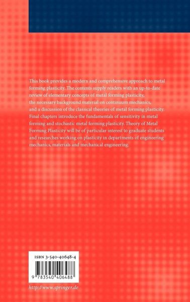 This book provides a modern and comprehensive approach to metal forming plasticity. The contents supply readers with an up-to-date review of elementary concepts of metal forming plasticity, the necessary background material on continuum mechanics, and a discussion of the classical theories of metal forming plasticity. Final chapters introduce the fundamentals of sensitivity in metal forming and stochastic metal forming plasticity. Theory of Metal Forming Plasticity will be of particular interest to graduate students and researches working on plasticity in deparments of engineering mechanics, materials and mechanical engineering.