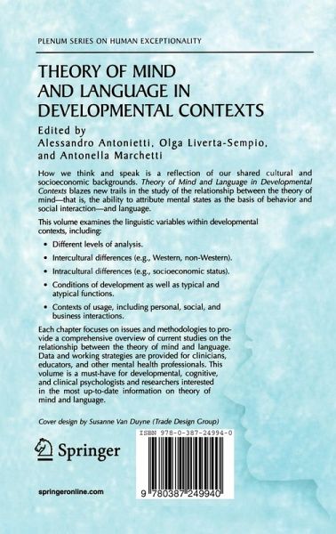 How we think and speak is a reflection of our shared cultural and socioeconomic backgrounds. Theory of Mind and Language in Different Developmental Contexts blazes new trails in the study of the relationship between the theory of mind-that is, the ability to attribute mental states as the basis of behavior and social interaction-and language.