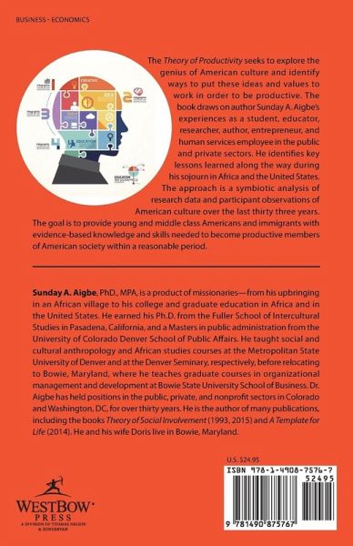 The Theory of Productivity seeks to explore the genius of American culture and identify ways to put these ideas and values to work in order to be productive. The book draws on author Sunday A. Aigbe's experiences as a student, educator, researcher, author, entrepreneur, and human services employee in the public and private sectors. He identifies key lessons learned along the way during his sojourn in Africa and the United States. The approach is a symbiotic analysis of research data and participant observations of American culture over the last thirty three years. The goal is to provide young and middle class Americans and immigrants with evidence-based knowledge and skills needed to become productive members of American society within a reasonable period.
