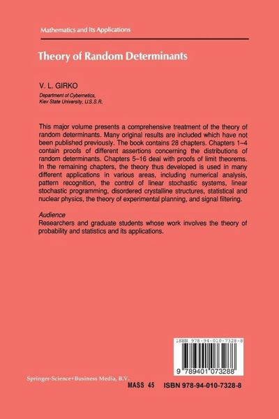 1. Generalized Wishart Density and Integral Representation for Determinants.- 2. Moments of Random Matrix Determinants.- 3. Distribution of Eigenvalues and Eigenvectors of Random Matrices.- 4. Inequalities for Random Determinants.- 5. Limit Theorems for the Borel Functions of Independent Random Variables.- 6. Limit Theorems of the Law of Large Numbers and Central Limit Theorem Types for Random Determinants.- 7. Accompanying Infinitely Divisible Laws for Random Determinants.- 8. Integral Representation Method.- 9. The Connection between the Convergence of Random Determinants and the Convergence of Functionals of Random Functions.- 10. Limit Theorems for Random Gram Determinants.- 11. The Determinants of Toeplitz and Hankel Random Matrices.- 12. Limit Theorems for Determinants of Random Jacobi Matrices.- 13. The Fredholm Random Determinants.- 14. The Systems of Linear Algebraic Equations with Random Coefficients.- 15. Limit Theorems for the Solution of the Systems of Linear Algebraic Equations with Random Coefficients.- 16. Integral Equations with Random Degenerate Kernels.- 17. Random Determinants in the Spectral Theory of Non-Self-Adjoint Random Matrices.- 18. The Distribution of Eigenvalues and Eigenvectors of Additive Random Matrix-Valued Processes.- 19. The Stochastic Ljapunov Problem for Systems of Stationary Linear Differential Equations.- 20. Random Determinants in the Theory of Estimation of Parameters of Some Systems.- 21. Random Determinants in Some Problems of Control Theory of Stochastic Systems.- 22. Random Determinants in Some Linear Stochastic Programming Problems.- 23. Random Determinants in General Statistical Analysis.- 24. Estimate of the Solution of the Kolmogorov-Wiener Filter.- 25. Random Determinants in Pattern Recognition.- 26. Random Determinantsin the Experiment Design.- 27. Random Determinants in Physics.- 28. Random Determinants in Numerical Analysis.- References.