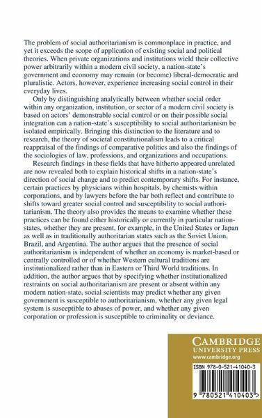 The problem of social authoritarianism is commonplace in practice, and yet it exceeds the scope of application of existing social and political theories. When private organizations and institutions wield their collective power arbitrarily within a modern civil society, a nation-state's government and economy may remain (or become) liberal-democratic and pluralistic. Actors, however, experience increasing social control in their everyday lives. Only by distinguishing analytically between whether social order within any organization, institution, or sector of a modern civil society is based on actors' demonstrable social control or on their possible social integration can a nation-state's susceptibility to social authoritarianism be isolated empirically. Bringing this distinction to the literature and to research, the theory of societal constitutionalism leads to a critical reappraisal of the findings of comparative politics and also the findings of the sociologies of law, professions, and organizations and occupations. Research findings in these fields that have hitherto appeared unrelated are now revealed both to explain historical shifts in a nation-state's direction of social change and to predict contemporary shifts. For instance, certain practices by physicians within hospitals, by chemists within corporations, and by lawyers before the bar both reflect and contribute to shifts toward greater social control and susceptibility to social authoritarianism. The theory also provides the means to examine whether these practices can be found either historically or currently in particular nation-states, whether they are present, for example, in the United States or Japan as well as intraditionally authoritarian states such as the Soviet Union, Brazil, and Argentina. The author argues that the presence of social authoritarianism is independent of whether an economy is market-based or centrally controlled or of whether Western cultural traditions are institutionalized rather than in Eastern or Third World traditions. In addition, the author argues that by specifying whether institutionalized restraints on social authoritarianism are present or absent within any modern nation-state, social scientists may predict whether any given government is susceptible to authoritarianism, whether any given legal system is susceptible to abuses of power, and whether any given corporation or profession is susceptible to criminality or deviance.