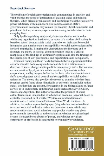 Sciulli argues that the existing conceptual frameworks of political and social theory restrict both theorists and empirical researchers to a narrow definition of authoritarianism. This 1992 book focuses on government structure and fails to take account of forms of social control exercised outside the governmental sphere. Rather than define authoritarianism primarily by contrast to liberal democracy, Sciulli argues, we need to broaden our conception of authoritarianism to include 'social authoritarianism', referring to social control imposed by private organizations and institutions. Sciulli develops an alternative conceptual framework, which he calls the theory of societal constitutionalism. He explains how the theory can be used to assess whether social order in a society, whether democratic or authoritarian in political rule, is characterized by some degree of social authoritarianism. The book will be important reading for theorists in sociology, political science and legal studies.