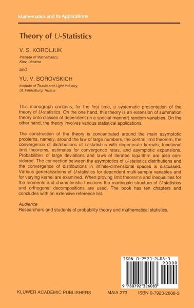 The theory of U-statistics goes back to the fundamental work of Hoeffding [1], in which he proved the central limit theorem. During last forty years the interest to this class of random variables has been permanently increasing, and thus, the new intensively developing branch of probability theory has been formed. The U-statistics are one of the universal objects of the modem probability theory of summation. On the one hand, they are more complicated "algebraically" than sums of independent random variables and vectors, and on the other hand, they contain essential elements of dependence which display themselves in the martingale properties. In addition, the U -statistics as an object of mathematical statistics occupy one of the central places in statistical problems. The development of the theory of U-statistics is stipulated by the influence of the classical theory of summation of independent random variables: The law of large num bers, central limit theorem, invariance principle, and the law of the iterated logarithm we re proved, the estimates of convergence rate were obtained, etc.