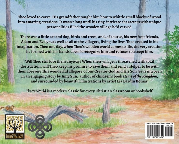 Theo loved to carve. His grandfather taught him how to whittle small blocks of wood into amazing creations. It wasn't long until his tiny, intricate characters with unique personalities filled the wooden village he'd carved. There was a little cat and dog, birds and trees and of course his new best friends, Adam and Evelyn, as well as all of the villagers, living the lives Theo created in his imagination. Then one day, when Theo's wooden world comes to life, the very creation he formed with his hands doesn't recognize him and refuses to accept him. Will Theo still love them anyway? When their village is threatened with total destruction, will Theo keep his promise to save them and send a Helper to be with them forever? This wonderful allegory of our Creator God and His Son Jesus is woven in an engaging story by the author of the children's book, Heart of the Kingdom, Amy Sun, and surrounded by beautiful illustrations by artist Lia Bardin Bomar. Theo's World is a modern classic for every Christian classroom or bookshelf.
