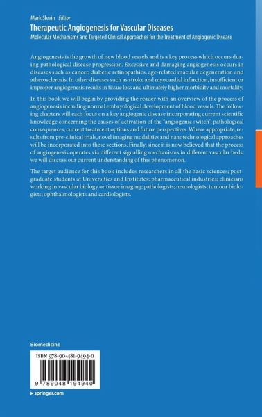 Angiogenesis is the growth of new blood vessels and is a key process which occurs during pathological disease progression. Excessive and damaging angiogenesis occurs in diseases such as cancer, diabetic retinopathies, age-related macular degeneration and atherosclerosis. In other diseases such as stroke and myocardial infarction, insufficient or improper angiogenesis results in tissue loss and ultimately higher morbidity and mortality. In this book we will begin by providing the reader with an overview of the process of angiogenesis including normal embryological development of blood vessels. The following chapters will each focus on a key angiogenic disease incorporating current scientific knowledge concerning the causes of activation of the "angiogenic switch", pathological consequences, current treatment options and future perspectives. Where appropriate, results from pre-clinical trials, novel imaging modalities and nanotechnological approaches will be incorporated into thesesections. Finally, since it is now believed that the process of angiogenesis operated via different signalling mechanisms in different vascular beds, we will discuss our current understanding of this phenomenon. The target audience for this book would include researchers in all the basic sciences; post-graduate students at Universities and Institutes; pharmaceutical industries; clinicians working in vascular biology or tissue imaging; pathologists; neurologists; tumour biologists; ophthalmologists and cardiologists.