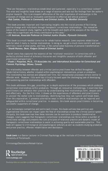The relationship between offender and criminal justice practitioner has shifted throughout rehabilitative history, whether situated within psychological interventions, prison or probation. This relationship has evolved and adapted over time, but interpersonal processes remain central to offender work. However, little work has critically focused upon the challenging task of developing and sustaining positive relationships with offenders. This book addresses this gap, providing an in-depth exploration of the processes which underpin correctional relationships within probation. Through an innovative methodology, it examines how practitioners can enhance their practice by understanding how relationships form, deepen and end effectively. For the first time, it draws on the experiences of offenders and practitioners to uncover the darker side to relationships, identifying how they can rupture and break down. From this exploration, it presents alternative ways in which relationships can be repaired and safeguarded within correctional practice. In essence, this book assists practitioners in becoming successful supporters of change. In an increasingly competitive and politicised climate, this book outlines how political and organisational tensions can impact upon the flow of relationships across the criminal justice system. Uniquely, this book examines how these tensions can be overcome to produce transformative changes. Lewis suggests that therapeutic correctional relationships can thrive within a number of correctional settings and presents the core principles of relational practice and dynamic model of therapeutic correctional relationships to assist in achieving quality and sustainable practice. This book will appeal to criminological and psychological scholars as well as students studying probation and prison practice, offender rehabilitation and desistance.