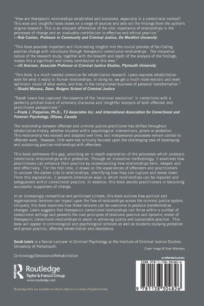 This book examines therapeutic correctional relationships within rehabilitative practice. It draws upon primary research that investigated the nature of relationships, their evolution over time and events that threaten their development (ruptures). It presents practical advice to promote the use of relationships within rehabilitative practice, acknowledging the challenges that this brings.