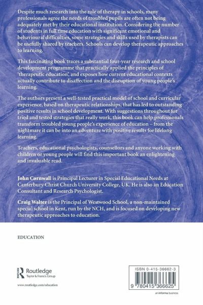 The role of therapy in schools is a topic that has been significantly under-researched and often overlooked. Considering the number of students in full-time education with serious emotional and behavioural difficulties, the skills and tricks used by therapists can be usefully passed on to teachers in the classroom. This book traces a substantial four-year project that applied the principles of therapeutic education in one school setting and exposed how current educational contexts actually contribute to disaffection and disruption of young people's learning. The authors propose a practical model of school and curricular experience, based on therapeutic relationships, that has led to outstanding positive results in school development. With suugestions throughout for tried-and-tested strategies that really work, this book will help professionals turn troubled young people's experience of education from the nightmare it often is, into an adventure with positive results for lifelong learning.