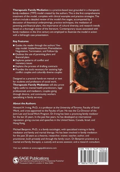 Designed as a practical hands-on manual or text for students and professors of social work, Therapeutic Family Mediation will also prove highly useful to mental health practitioners, legal professionals and mediators, couples going through divorce, and community workers specializing in family services. Key Features:Guides the reader through the authors' five-step model: Intake/Assessment, Pre-Mediation, Negotiation, Termination, and Follow-Up Outlines the use of parenting plans and financial plans Explores patterns of conflict and monetary issues Explains the process of drafting contracts Provides the tools necessary for assisting high-conflict couples and culturally diverse couples
