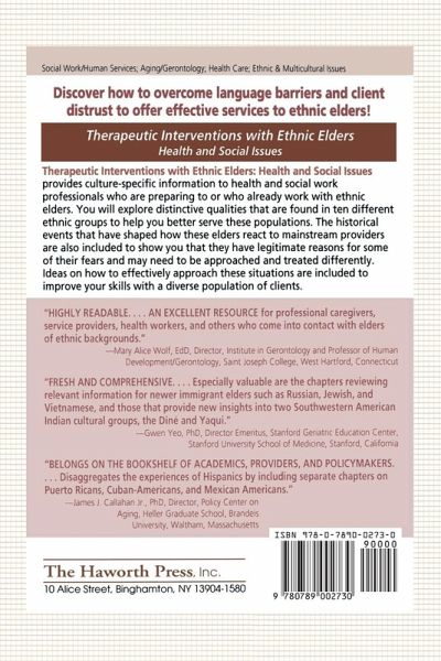 Provide effective services to ethnic elders with culturally competent training!Therapeutic Interventions with Ethnic Elders: Health and Social Issues provides culture-specific information to health and social work professionals. You will explore distinctive qualities that are found in ten different ethnic groups to help you better serve these populations. The historical events that have shaped these elders'often-adverse reactions to mainstream providers are also included. Ideas on how to effectively approach these situations are included to improve your skills with a diverse population of clients. The information in Therapeutic Interventions with Ethnic Elders is invaluable to health care administrators who plan services and hire personnel to work with various ethnic groups. The book also functions as a training tool to increase the awareness of staff members who currently work with ethnically diverse populations. You will learn to recognize culturally driven behaviors in ethnic elders and how to make appropriate interventions. Some of the general and culture-specific issues that Therapeutic Interventions with Ethnic Elders addresses are: helping ethnic elders to feel comfortable utilizing your services appropriately modifying therapy to meet the individual's cultural background reinforcing a new sense of independence for these elders by helping them understand available services understanding cultural inhibitions in Japan that hide, deny, or ignore mental illness realizing that traditional Euro-American psychotherapy techniques cannot be readily transplanted and applied to all other cultures addressing depression, anxiety, increased illness, intergenerational conflict, and even marital conflict combined with the stress of assimilation and acculturation among Russian emigrants understanding folk beliefs and the importance of the role of the church for many elder African-Americans Therapeutic Interventions with Ethnic Elders addresses the need for practitioners, agencies, and institutions to understand and respect the different characteristics of each elderly minority population. You will examine the unique historical contexts of Vietnamese, Japanese, Chinese, African, Russian, Navajo, Yaqui, Mexican, Cuban, and Puerto Rican elders and explore the stress factors that come with immigrating, such as finding a peaceful place to live and being confronted by age discrimination and racism. This important book explains cultural behaviors to provide you with effective suggestions for providing optimum care to the ethnic elders in your life.