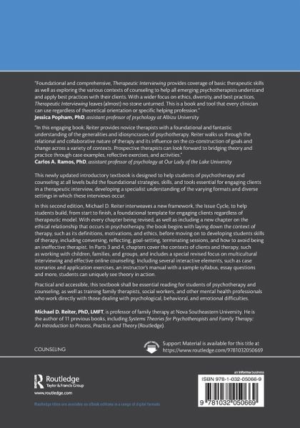 In this second edition, Michael D. Reiter interweaves a new framework, the Issue Cycle, to help students build, from start to finish, a foundational template for engaging clients regardless of therapeutic model. With every chapter being revised, as well as including a new chapter on the ethical relationship that occurs in psychotherapy, the book begins with laying down the context of therapy, such as its definitions, motivations, and ethics, before moving on to developing students skills of therapy, including conversing, reflecting, goal-setting, terminating sessions, and how to avoid being an ineffective therapist. In Parts 3 and 4, chapters cover the contexts of clients and therapy, such as working with children, families, and groups, and includes a special revised focus on multicultural interviewing and effective online counseling. Including several interactive elements, such as case scenarios and application exercises, an instructor's manual with a sample syllabus, essay questions and more, students can uniquely see theory in action.