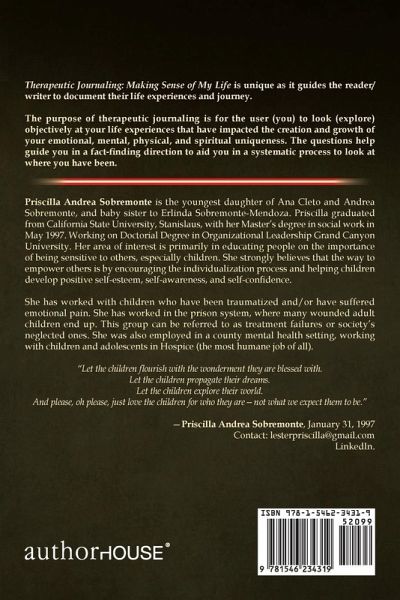 Therapeutic Journaling: Making Sense of My Life is unique as it guides the reader/writer to document their life experiences and journey. The purpose of therapeutic journaling is for the user (you) to look (explore) objectively at your life experiences that have impacted the creation and growth of your emotional, mental, physical, and spiritual uniqueness. The questions help guide you in a fact-finding direction to aid you in a systematic process to look at where you have been.
