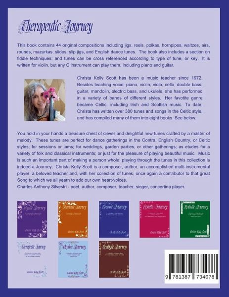 Therapeutic Journey contains 44 original compositions including jigs, reels, polkas, hornpipes, waltzes, airs, rounds, mazurkas, slides, slip jigs, and dance tunes, in the Celtic style for violin (fiddle) or any other C instrument such as flute, penny whistle, concertina, accordion, mandolin, banjo, guitar, or piano. Chord notation is included for accompaniment. It also contains personal inspirations, stories of my journey with an auto-immune disease, coping with a pandemic, as well as a few pictures; all surrounded by graphics that could be colored if so desired. The Appendix includes instruction on how to play the fiddle style as well as a breakdown of the tunes in their categories and keys. This is not your ordinary music book. It's a magical experience (journey) for the beginning musician as well as the seasoned professional. Therapeutic Journey is book #6 of eight books in the series "The Bardic Journeys of Kelawen".