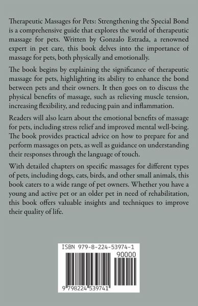 Therapeutic Massages for Pets: Strengthening the Special Bond is a comprehensive guide that explores the world of therapeutic massage for pets. Written by Gonzalo Estrada, a renowned expert in pet care, this book delves into the importance of massage for pets, both physically and emotionally. The book begins by explaining the significance of therapeutic massage for pets, highlighting its ability to enhance the bond between pets and their owners. It then goes on to discuss the physical benefits of massage, such as relieving muscle tension, increasing flexibility, and reducing pain and inflammation. Readers will also learn about the emotional benefits of massage for pets, including stress relief and improved mental well-being. The book provides practical advice on how to prepare for and perform massages on pets, as well as guidance on understanding their responses through the language of touch. With detailed chapters on specific massages for different types of pets, including dogs, cats, birds, and other small animals, this book caters to a wide range of pet owners. Whether you have a young and active pet or an older pet in need of rehabilitation, this book offers valuable insights and techniques to improve their quality of life.